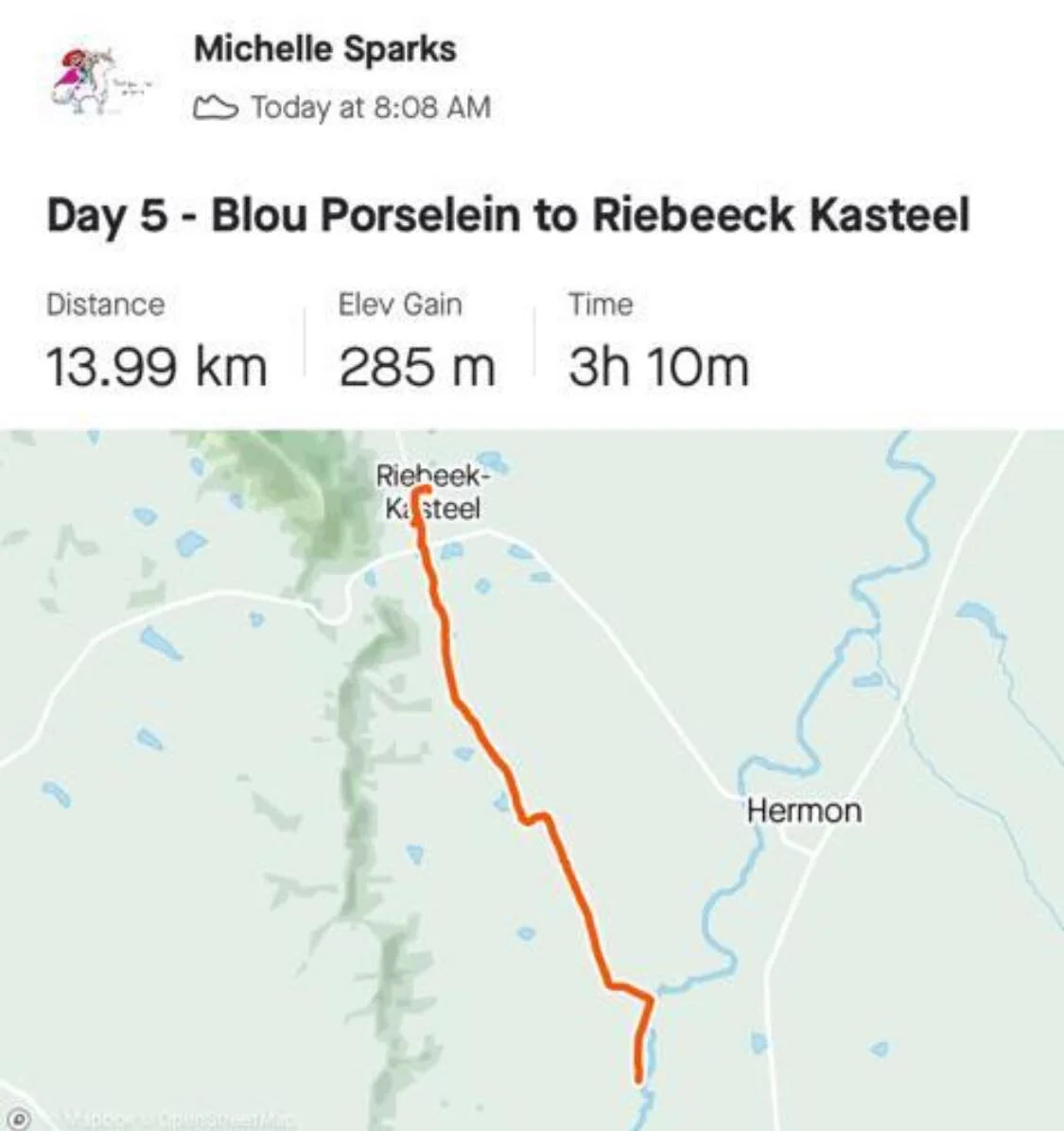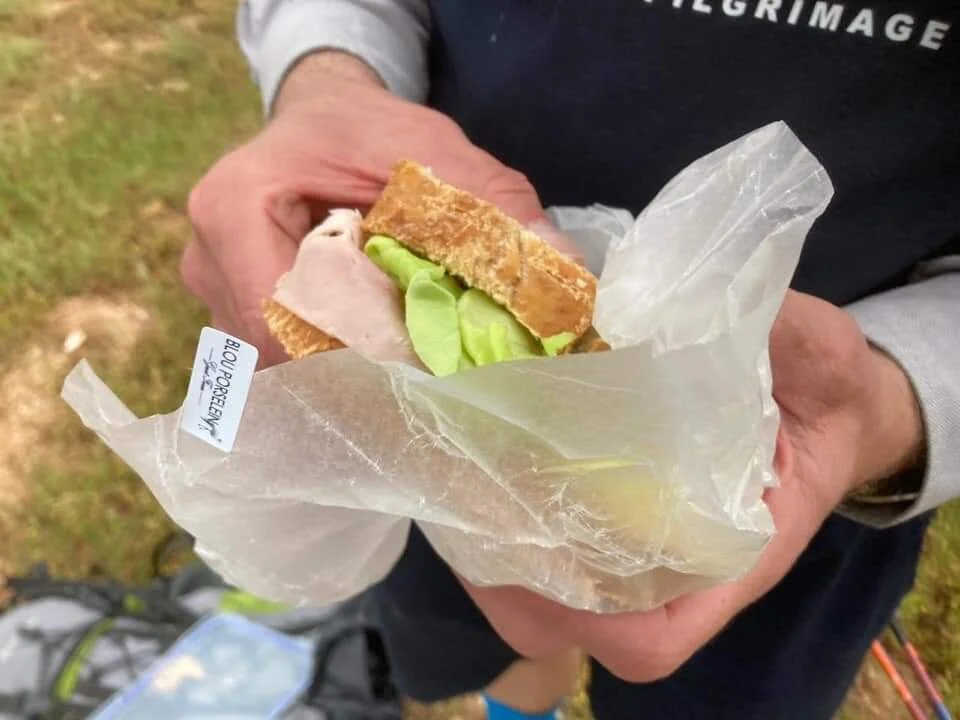 Pilgrims enjoy their breakfast just past the half-way mark with home-made sarmies, made with “plaasbrood” fresh from the oven. Boiled free range eggs and fresh seasonal fruits (sponsored by local farmers) are also provided.